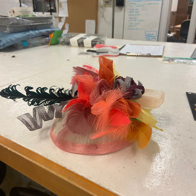 This was made using wet forming techniques to achieve the shapes within the sinamay. Utilizing feathers helped to enhance the design.